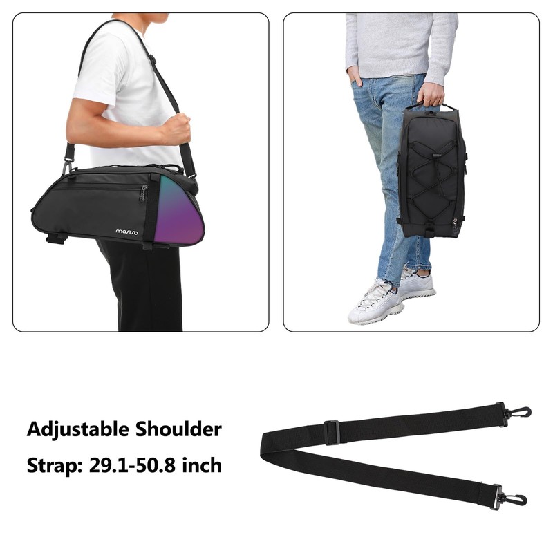 - This bike rear seat bag with sturdy handle is easy for you to carry it. And come with a flexible satchel shoulder strap varied from 29.1 to maximum 50.8 inch can be adjusted loose or tight to fit your body. Suitable for cycling, traveling, commuting, camping and outdoor.