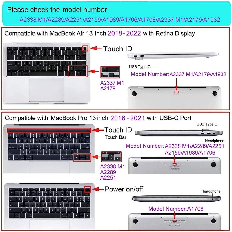 - Compatible with MacBook Pro 13 inch 2024 2023 2022 2021 2020 2019 2018 2017 2016 Release (Models: M2 M1 A2338 A2289 A2251 A2159 A1989 A1706 with Touch Bar and A1708 without Touch Bar); Compatible with MacBook Air 13.6 inch 2024 2023 2022 Release (Models: M3 A3113 M2 A2681); Compatible with MacBook Air 13 inch with Retina Display and Touch ID 2022 2021 2020 2019 2018 Release (Models: A2337 M1 A2179 A1932).