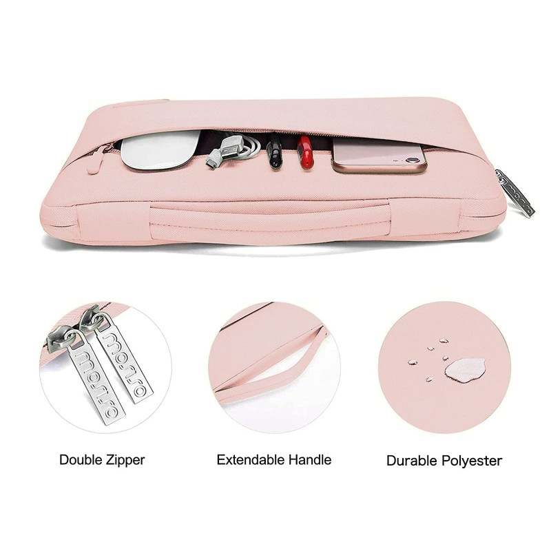 - The 360 degree protective shockproof laptop sleeve with handle carrying bag is made of polyester material, protect your laptop against accidental spills. Slim and lightweight, does not bulk your device up and can easily slide into your briefcase, backpack or other bag. Ideal for business, daily and travel.