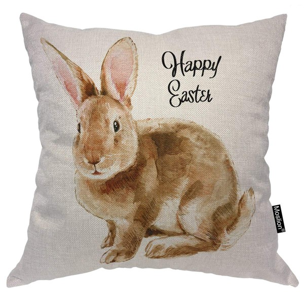 Moslion Rabbit Pillow Cover Cute Animal Sketch Bunny Quote Happy Easter Throw Pillow Case 18x18 Inch Cotton Linen Canvas Square Cushion Decorative Cover Sofa Bed Brown Feather