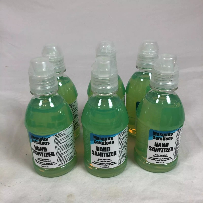 Up for sale is Mosquito Solutions Hand Sanitizer in an 8 Ounce/263 ml size flip-top bottle. This sanitizer is Made in the U.S.A. It contains 75% Isopropyl Alcohol. Other Ingredients include Purified Water, Hydrogen Peroxide, Glycerin, and Aloe Vera. Note that it doesn't contain a bunch of other ingredients that are hard to spell let alone know what they are for. This solution has a light green color during application but drys clear. Don’t miss your chance to add this bacteria-fighting solution to your arsenal of germ protection. Note that no claims are being made as to its ability to repel mosquitos.