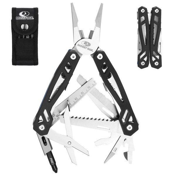 Mossy Oak 22-in-1 Multi-Tool Pliers Includes Carry Bag |Stainless Steel Multifunctional Tool Featuring A Wire Cutter, Bottle Opener, and Screwdriver | Perfect for Camping and Maintenance | Black