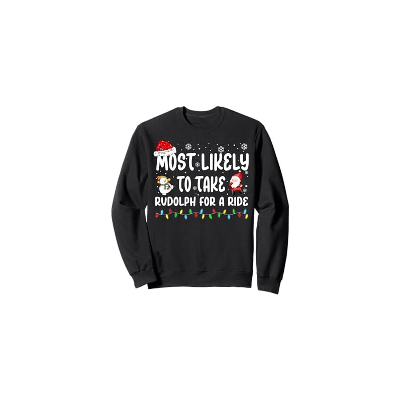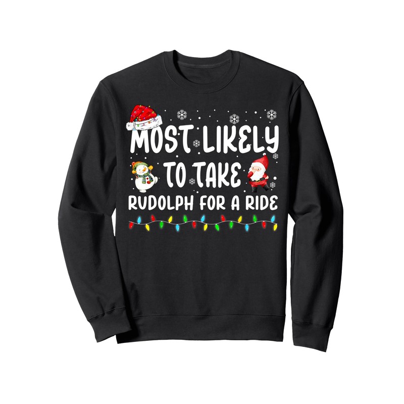- Most Likely To Take Rudolph For A Ride Funny Xmas Sasquatch shirt, long sleeve, pajamas, vneck, sweatshirt, hoodie is last minute Christmas gift for women, kids, men, toddler, grandkids, daughter, son, grandma, grandpa, mom, dad, her, him, wife, husband.