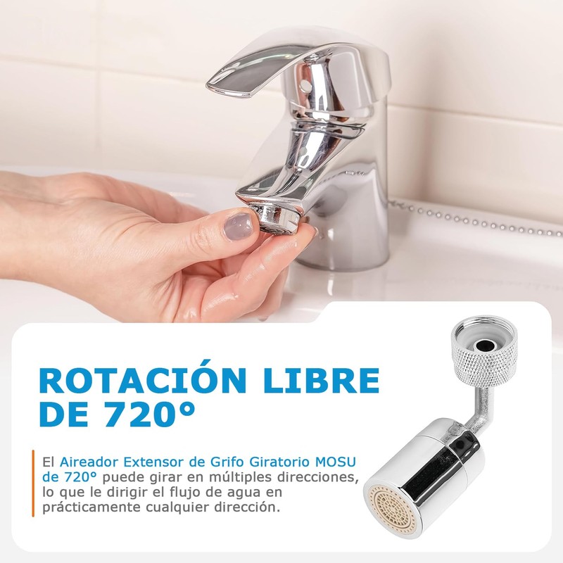 La extensión del aireador giratorio del grifo MOSU puede aumentar la presión del agua, el agua y el aire completamente mezclados para lograr un mejor efecto de limpieza.