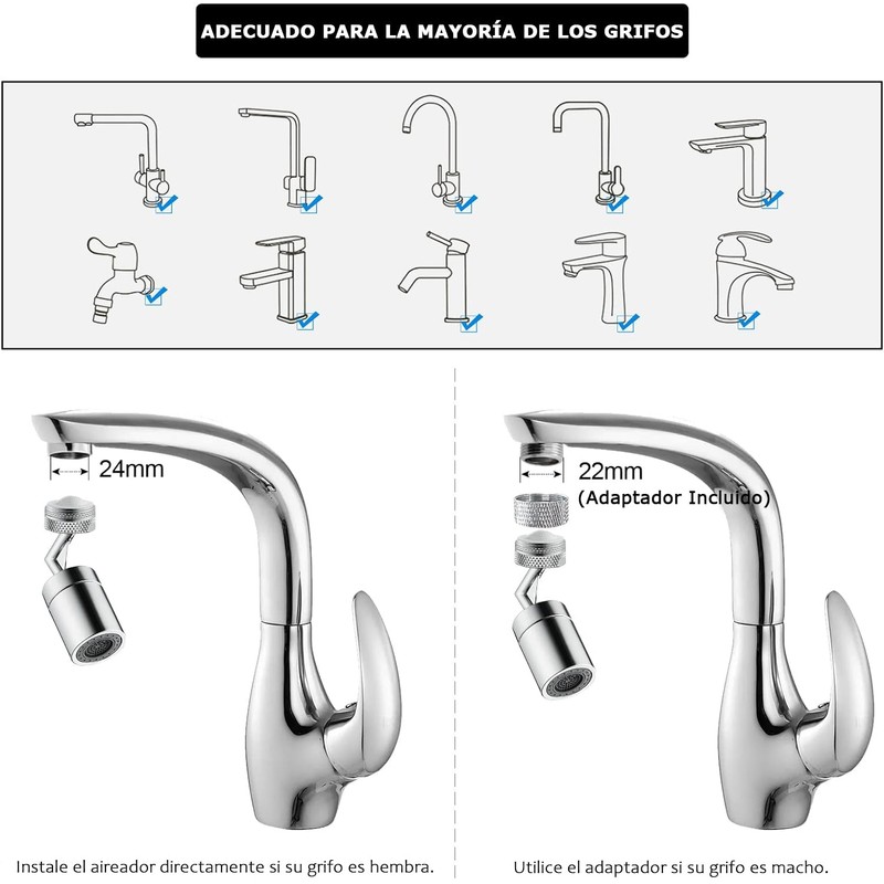 - 【Preste Atención al Tamaño】El aireador de grifo MOSU es un aireador de rosca hembra de 22 mm (si su grifo es de rosca hembra, conéctelo directamente). Se incluye un adaptador de rosca macho de 24 mm (si su grifo tiene rosca macho, use el adaptador para conectar). POR FAVOR, COMPRUEBE EL DIÁMETRO DE SU GRIFO ANTES DE REALIZAR UN PEDIDO. GRACIAS.