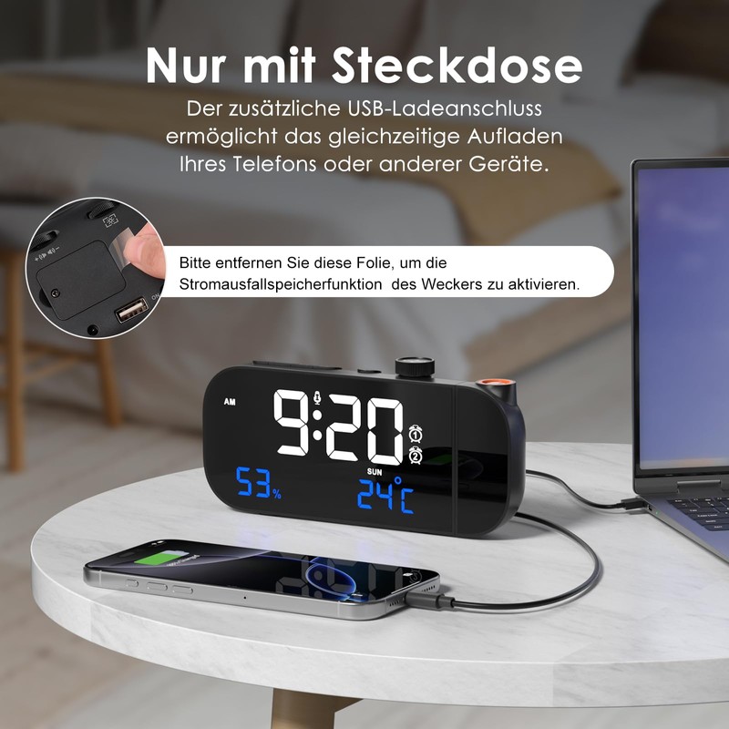 - Plug-in smart digital alarm clock: the alarm clock with projection must be connected to the socket for daily use and is not battery operated. The built-in battery backup function allows you to maintain the time and alarm settings in the event of a power failure. The additional USB output allows you to easily power your other smart devices while using the projection alarm clock. NOTE: BEFORE USE, REMOVE THE BATTERY PROTECTIVE FILM TO ACTIVATE THE MEMORY FUNCTION.
