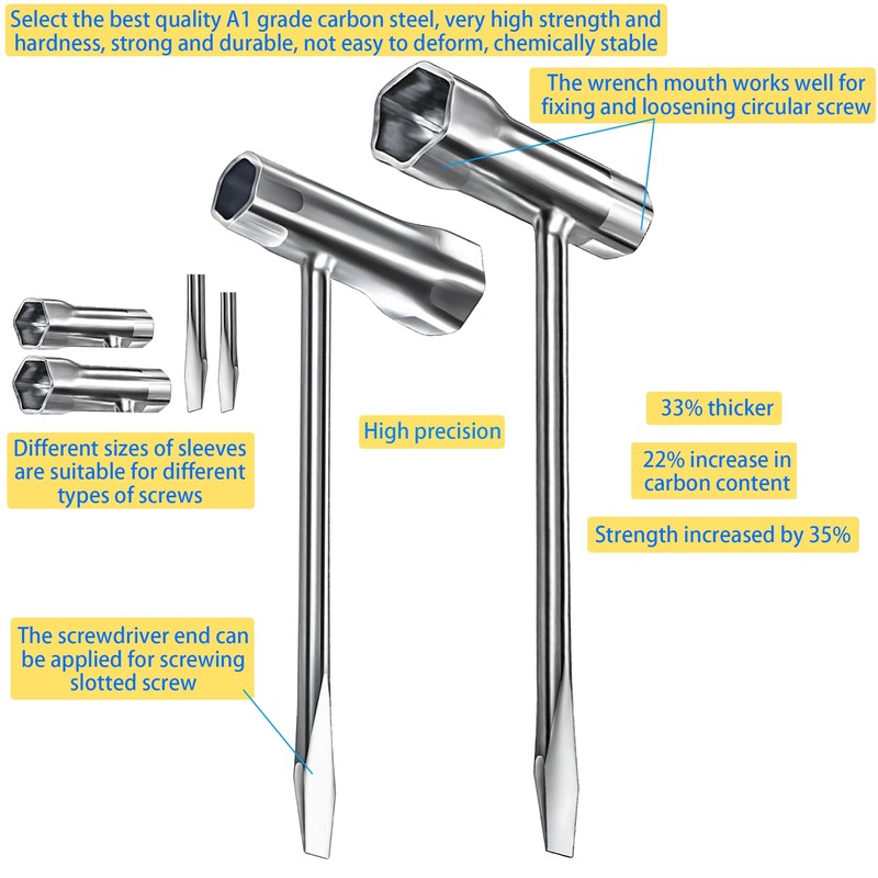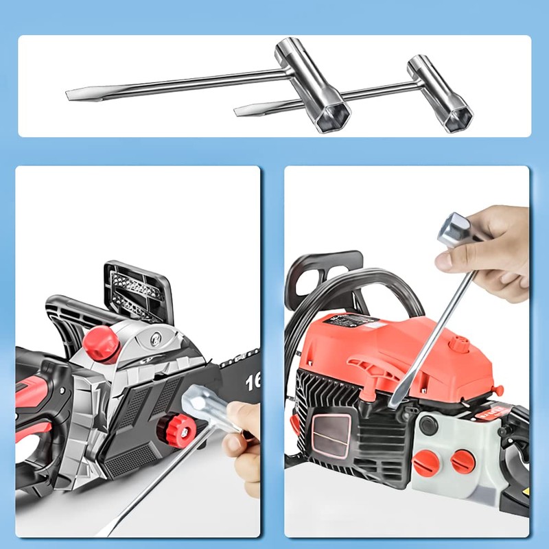 - Function: The replacement chain saw wrench is designed with two ends, the screwdriver end can be screwed into the slotted screw, the wrench mouth can fix and loosen the round screw well, the socket of different sizes can be suitable for different types of screws