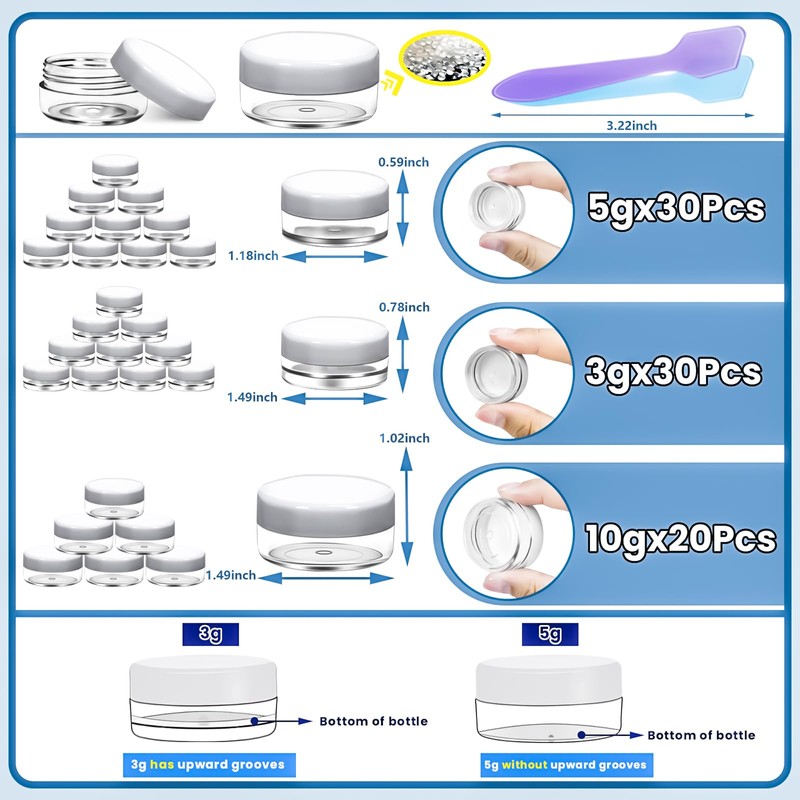 - Value Pack: The package comes with 80 pieces of travel containers in 3 different volumes with 30 pieces of 3gram, 30pieces of 5gram and 20 pieces of 10gram sample jars.Extra 20 pieces of mini spatulas for easy dispensing of large-volume beauty products