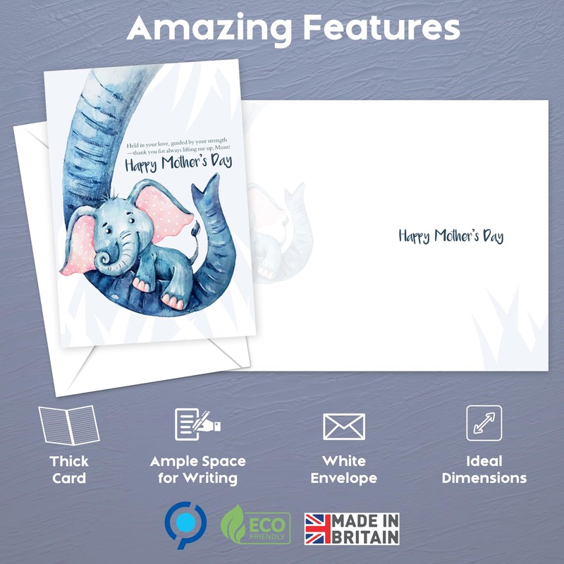 Mothers Day Card for Mum with Envelope | Cute Elephant Design | Happy Mother’s Day Card from Daughter or Son | 22x15.5 cm – Eco-Friendly 350 GSM - Made in the UK