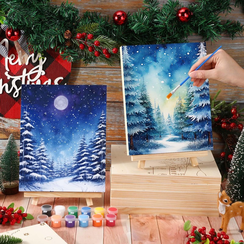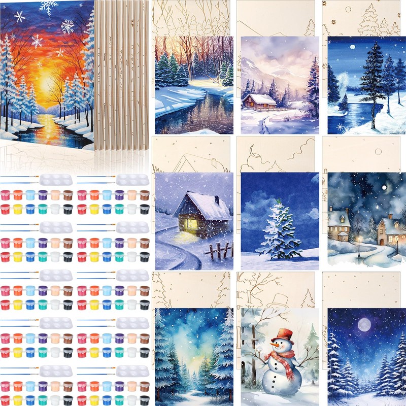 MotiMind 10 Set Pre Drawn Wooden Canvas for Painting Sip and Paint Kit 8" x 10" Pre Printed Canvases Wood Boards for Party Favor DIY Virtual Adult's Date Night(Winter Style)