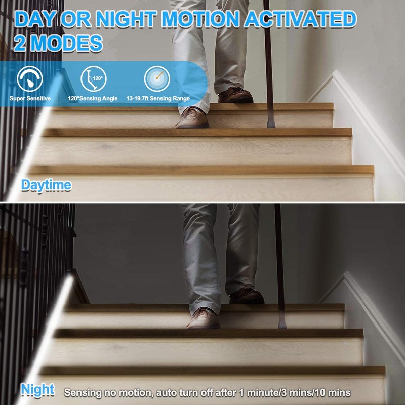 Motion Activated LED Strip Lights, 16.4ft LED Light Strip with Day or Night 2 Lighting Modes, 3 Timing Off Modes, Bright White 12v Plug-in LED Rope Lights for Under Cabinet, Kitchen, Stair, Bed, Room
