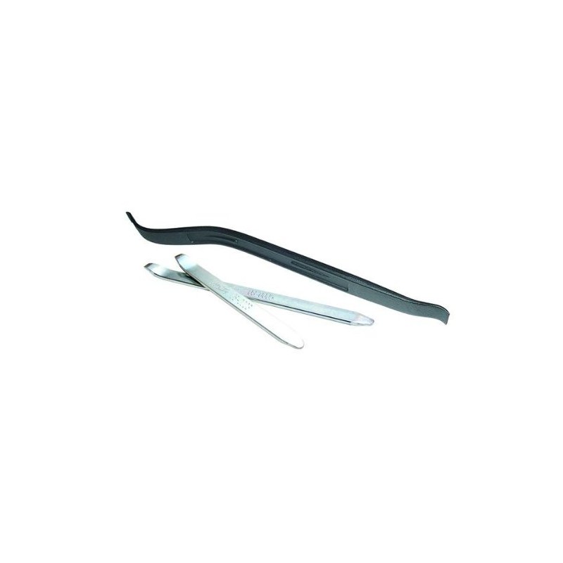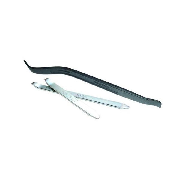 Set of three tire irons. Includes one 8-1/2 inch tire iron, one 11 inch tire iron and one 16 inch double compound curved tire iron.