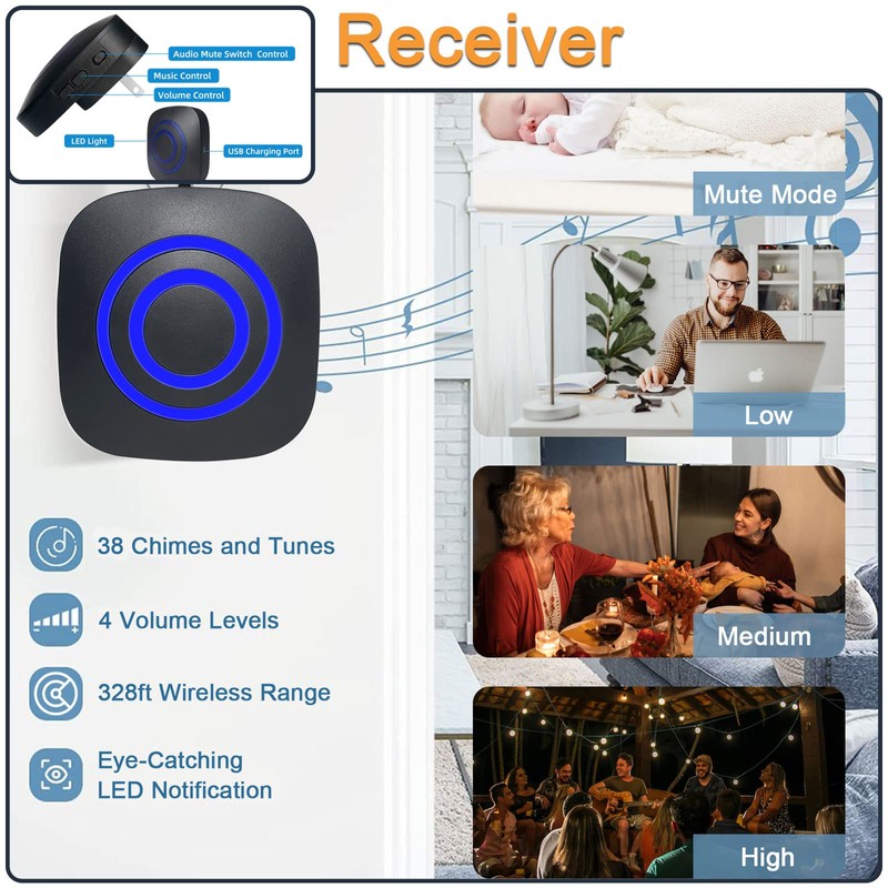 • 🔥【Optional alarm mode and 36 ringtones】Select the alarm mode (sound&LED flashing or LED flashing). Choose from 36 ringtones and customize the sound of the doorbell at any time according to personal preferences. With 3 levels of volume adjustment, you will not miss visiting visitors or customers.