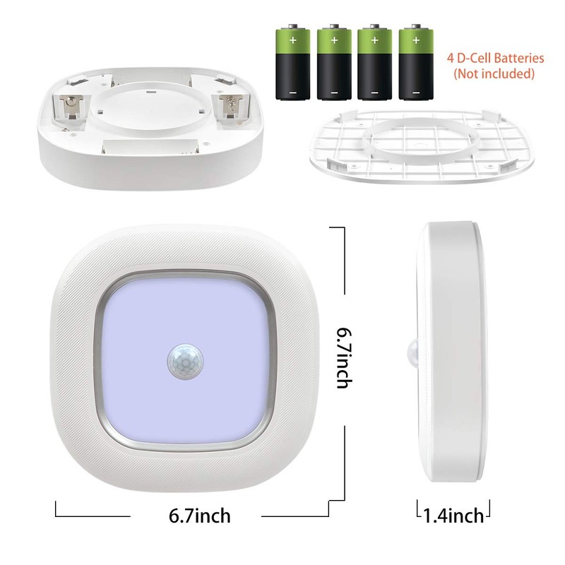 - Wireless Battery Powered - LED Ceiling Light powered by 4 D-cell batteries(not provided). Expect about half a year of light on each set of batteries with average use of 8-10 activation a day. Auto On, Free your hand anywhere, no more fumbling for the light switch in the dark.