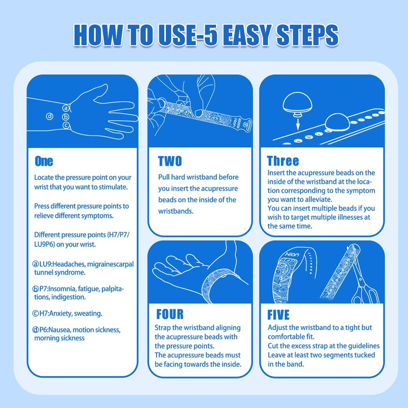 - Side Effect-Free Relief-Acupressure is a safe and gentle alternative therapy that helps alleviate symptoms of common nausea. Acupressure wristbands stimulate four key pressure points on your wrist to offer effective relief. Specifically, the point marked 'a' corresponds to LU9, 'b' corresponds to P7, 'c' corresponds to H7, and 'd' corresponds to P6. These points, when properly stimulated, can help relieve motion sickness, morning sickness, anxiety, stress, headaches, nausea, and palpitations