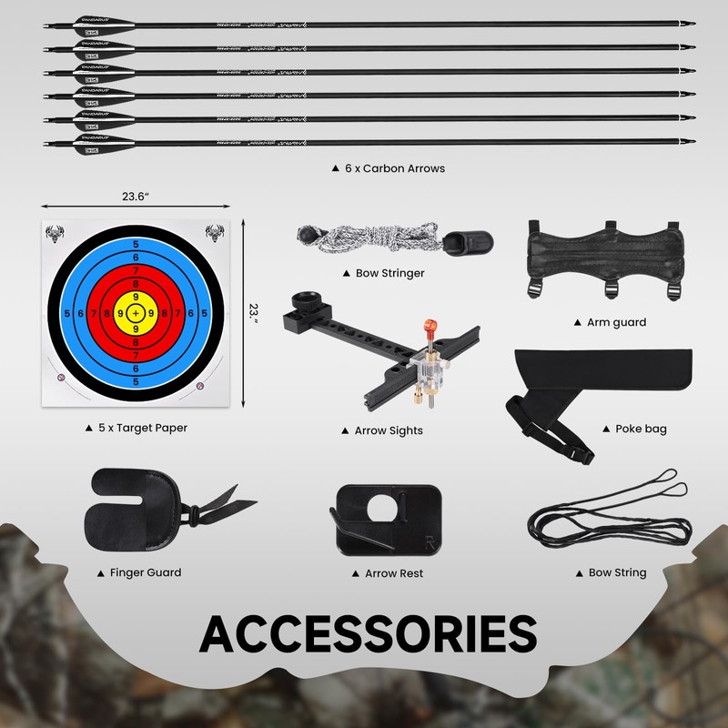 - 【PACKING LIST】:Fiberglass bow limbs×2, Bow stringer×1, Arrow rest×1, Arrow sights×1, Finger guard×1, Arm guard×1, Targe paper×5, Carbon arrows×6
