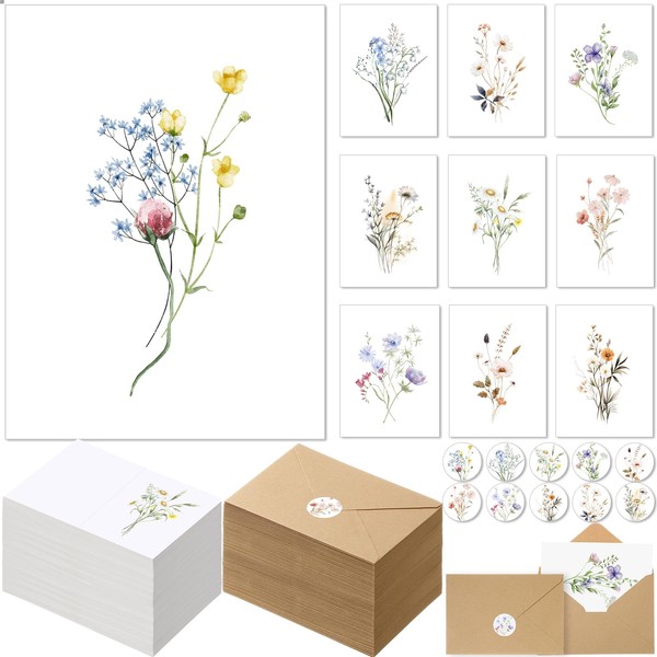 Motiskyy 100 Pack Blank Cards and Envelopes 4 x 6 Elegant Floral Greeting Card with Stickers Wildflowers Blank Note Cards and Envelopes Stationary Set, 10 Assorted Floral Design for All Occasions