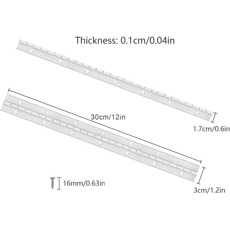 【PACKAGE】You will receive 2 pcs piano cabinet hinges for surface mount for quick installation, measuring 30cm/12inch in length, 1/32" blade thickness and 1-3/16" opening width, which are longer than other metal hinges on the market. And coming with 24 screws. Enough to meet your needs.