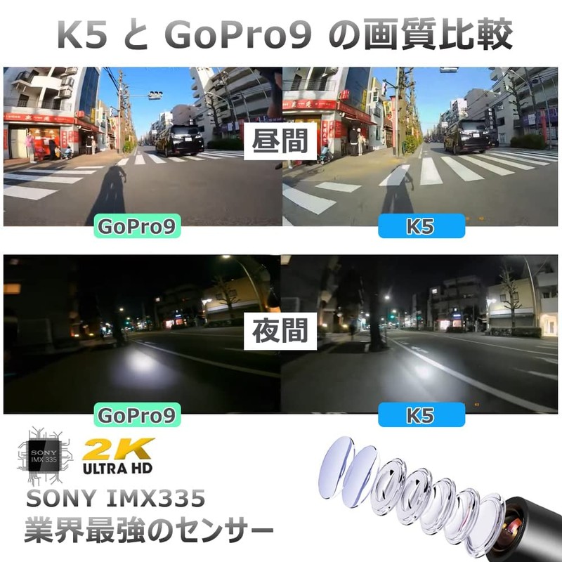 • S-ONY IMX335 Sensor & 2K Pixels: The bike drive recorder is equipped with a S-ONY STARVIS image sensor that is strong even at night at 2304 x 1296 P (30 FPS) that allows you to shoot high resolution. ✎ Comparison of K5 and GoPro 9: youtu.be/--fUlMQr4M0