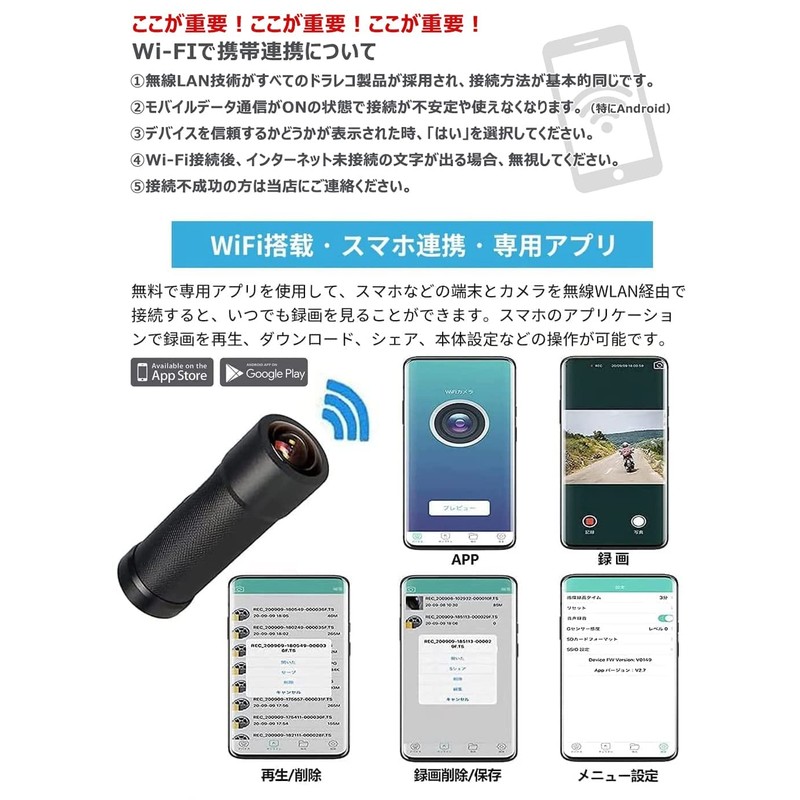 • WiFi Function & App Operation: A dedicated app for drive recorder to Android and iOS is distributed for free. You can set the drive recorder with your smartphone to check videos, share and delete videos