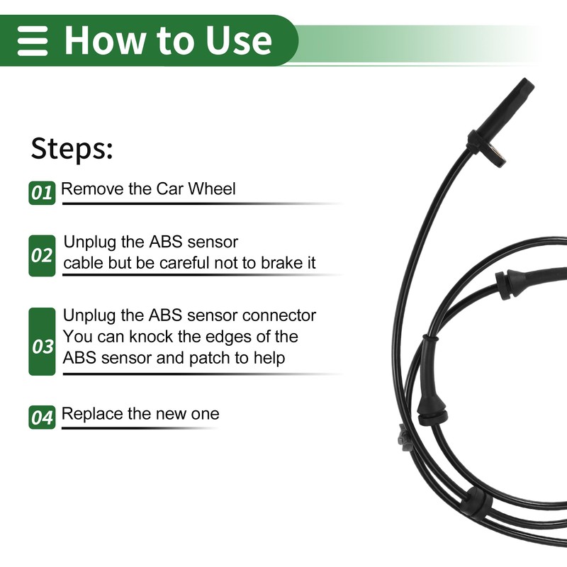 - Installation Guide: Easy Installation.Remove the car wheel, unplug the ABS sensor and sensor connector, then replace the new abs sensor.