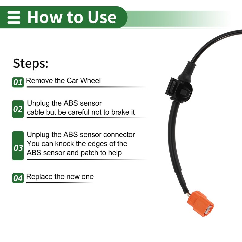 - Installation Guide: Easy Installation.Remove the car wheel, unplug the ABS sensor and sensor connector, then replace the new abs sensor.