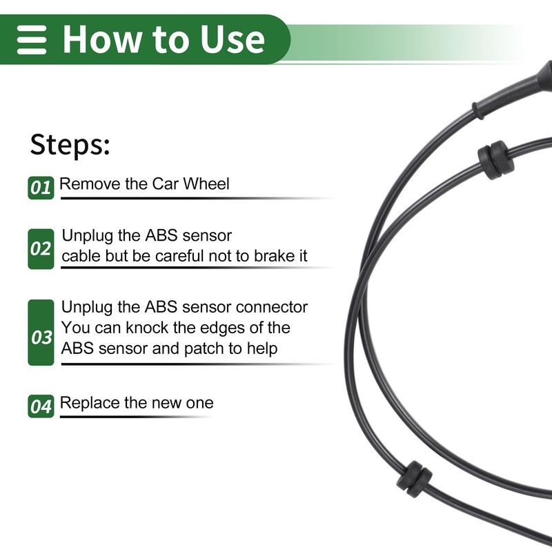 - Installation Guide: Easy Installation.Remove the car wheel, unplug the ABS sensor and sensor connector, then replace the new abs sensor.