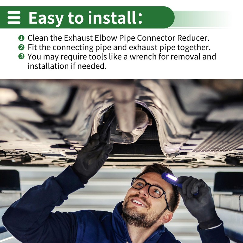 - Installation Guide:Easy to install: 1. Clean the Exhaust Pipe Adapter Connector Reducer. 2. Fit the connecting pipe and exhaust pipe together. 3. You may require tools like a wrench for removal and installation if needed