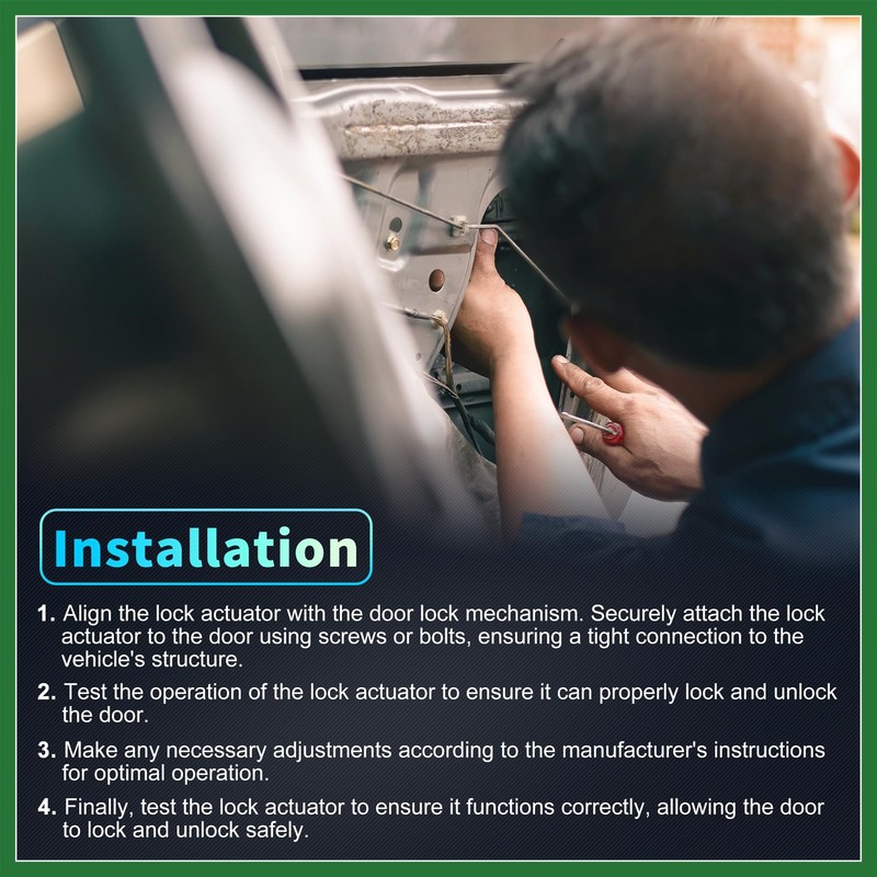 - Nice: Easy to install: 1. Align the lock actuator with the door lock mechanism. Securely attach the lock actuator to the door using screws or bolts, ensuring a tight connection to the vehicle's structure. 2. Test the operation of the lock actuator to ensure it can properly lock and unlock the door. 3. Make any necessary adjustments according to the manufacturer's instructions. 4. Test the lock actuator to ensure it functions correctly, allowing the door to lock and unlock safely.