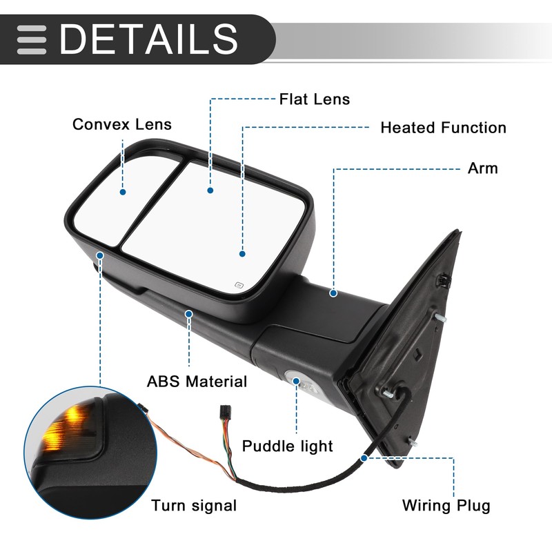 - How to Install: Just simply connect the plugs of the trailer towing mirror to the corresponding power for cord, no drilling or modifications required(professional installation would be highly recommended)