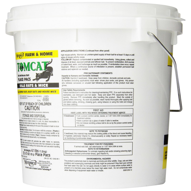 Tomcat rat and mouse bait place.-Tougher than a barnyard cat for controlling rats and mice.-Tuman food-grade ingredients and enhancers, for a bait so palatable that rats and mice.-Kills rats and mice in 4-6 days.-Size: 3 Ounce.