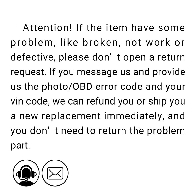 Attention! If the item have some problem, like broken, not work or defective, please don’t open a return request. If you message us and provide us the photo/OBD error code and your vin code, we can refund you or ship you a new replacement immediately, and you don’t need to return the problem part.