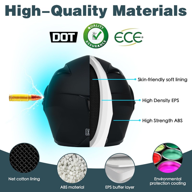 - 【Security certification】: The Bluetooth motorcycle helmet complies with DOT FMVSS-218 safety standards and obtains all US road traffic safety certifications. High-strength ABS shell and EPS buffer layer ensure your riding safety in outdoor life