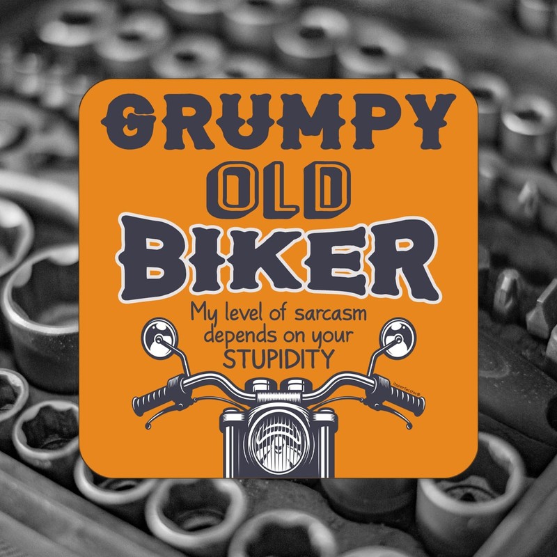 Motorcycle Coaster. Grumpy Old Biker - My Level of Sarcasm Depends on Your Stupidity. Funny Garage Drinks Mat. Biker Themed Man Cave Décor.