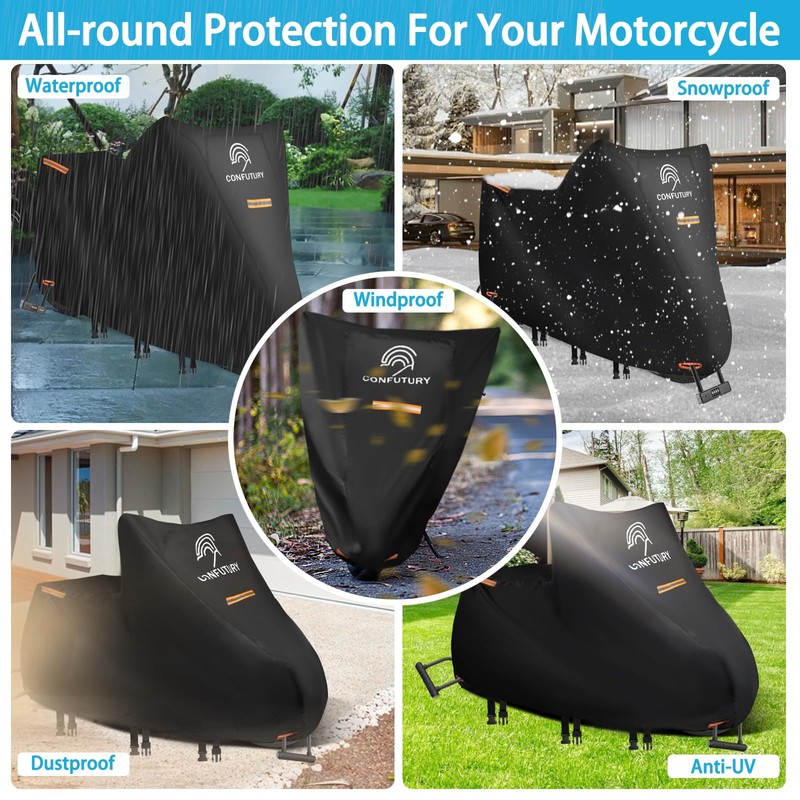 Motorcycle Cover Heavy Duty,CONFUTURY 600D Motorcycle Covers Waterproof Outdoor Storage with License Plate Window,4 Reflective Strips,2 Locking Holes,3 Windproof Buckles(2XL 90"x37"x50")