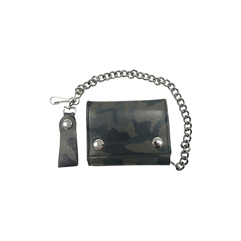 Motorcycle Men's Tri-Fold Wallet Genuine Leather Biker Chain, Green Camo OCF315