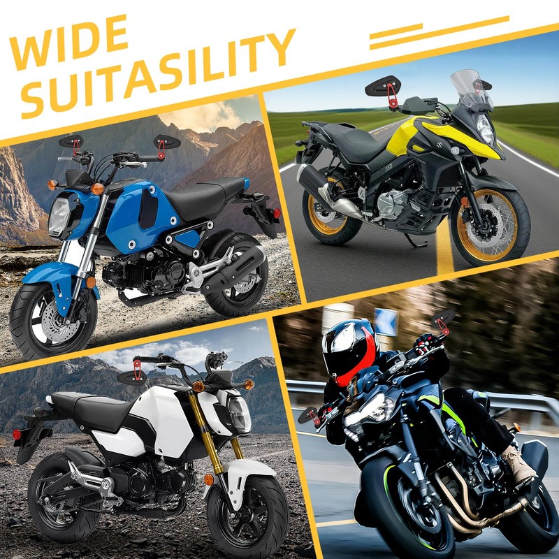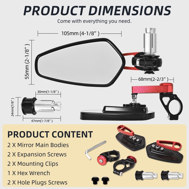 • Durable & Weatherproof: Crafted from CNC aluminum alloy with high-class painted, these bar end mirrors resist water and rust. Built to withstand tough conditions, they're your long-lasting riding companion.