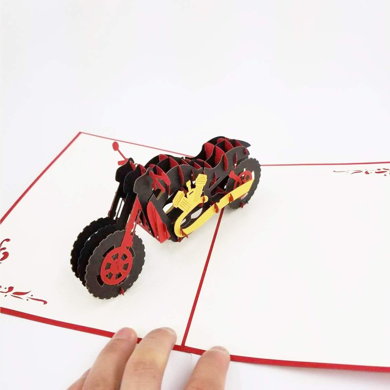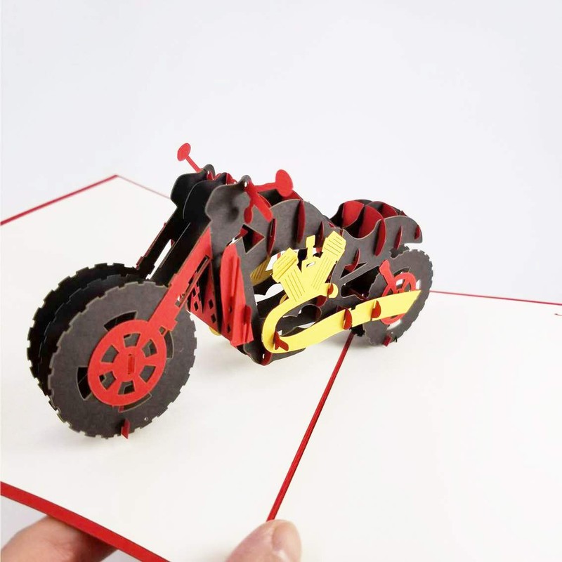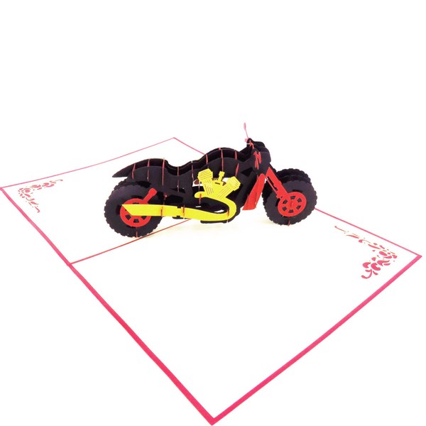 - Open the 3D card to discover a 3D pop up motorcycle in daring red, black, and yellow tones. The bold motorcycle featured in the center of this 3D motorcycle greeting card is beautifully streamlined and looks ready to take on the road!