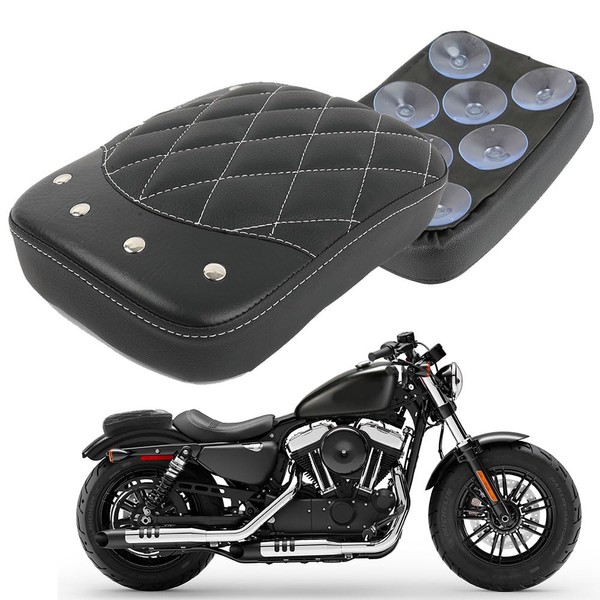 Motorcycle Rectangular Pillion Passenger Pad Seat 8 Suction Cup Rear Leather Passenger Seat Compatible with Harley Custom Cafe Racer Bobber Chopper Custom Application (Black Rhombus Pattern w/Rivet)