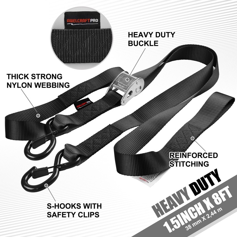 - PRODUCTS DETALS - 2PK 8FT Cambuckle Tie Down Set with Safety S Hook; For load up to: 1100lbs, break strength: 3300lbs