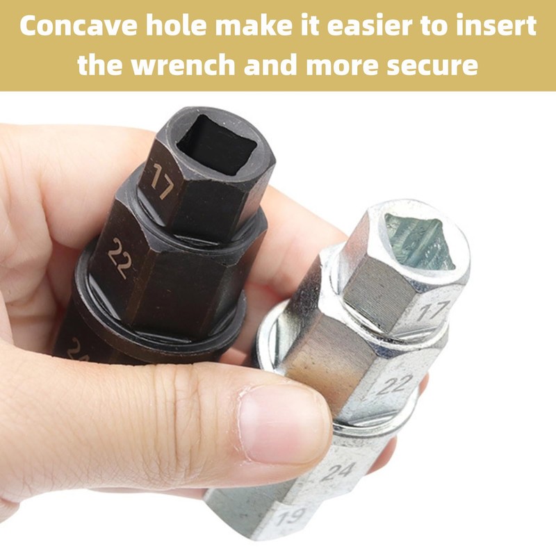 - 【Specifications】: There are four metric hexagonal sizes: 17 mm, 19 mm, 22 mm and 24 mm. The 19 mm side can be used with a 3/8" drive ratchet or open-end wrench, and the 17 mm side can only be used with an open-end wrench.