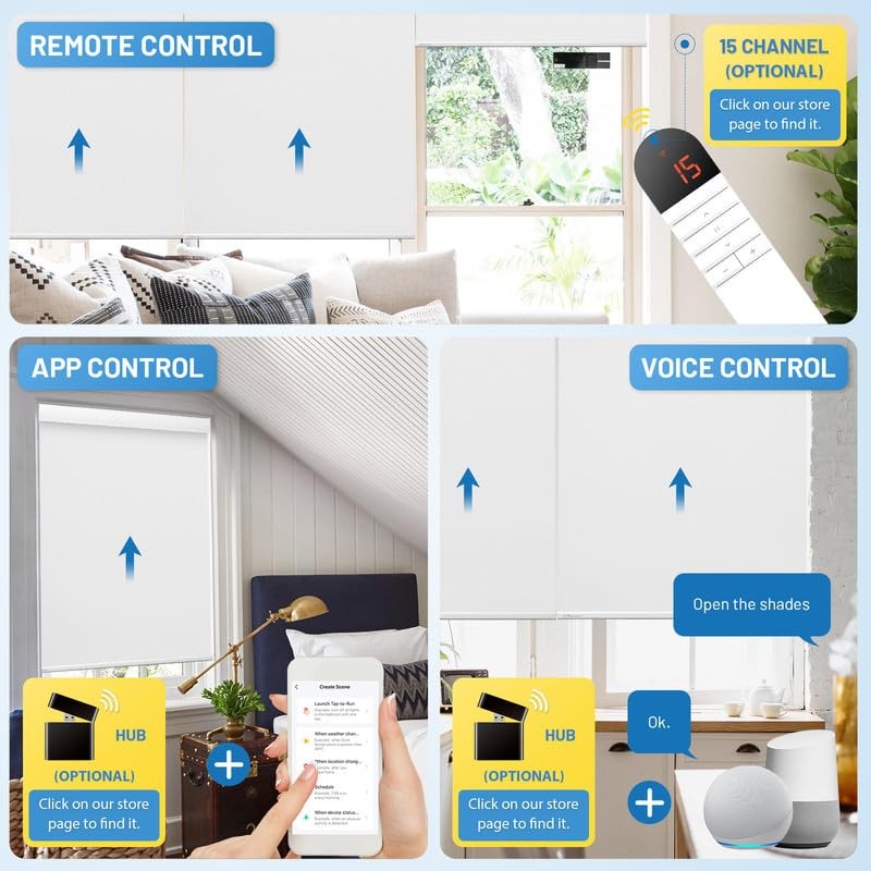 - Upgrade smart blinds: simple remote control can meet the daily use, if you have more electric blinds at home need to be controlled , then 15 channel remote control (purchase) is a good choice, it can control 15 blinds at the same time . Of course, you can also buy a hub, he can control up to 30 blinds at the same time,Through the connection of tuyaapp, you can realize the automatic take-off and landing of the set time,You can also connect alexa to achieve voice control of the electric blinds.