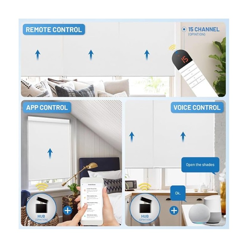 - Upgrade smart blinds: simple remote control can meet the daily use, if you have more electric blinds at home need to be controlled , then 15 channel remote control (purchase) is a good choice, it can control 15 blinds at the same time . Of course, you can also buy a hub, he can control up to 30 blinds at the same time,Through the connection of tuyaapp, you can realize the automatic take-off and landing of the set time,You can also connect alexa to achieve voice control of the electric blinds.