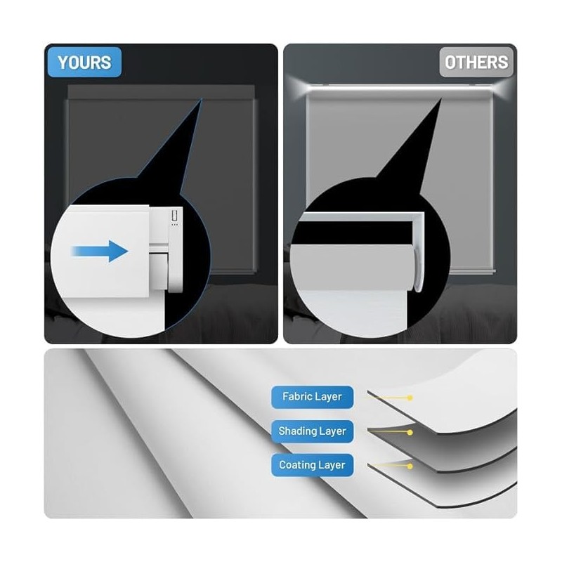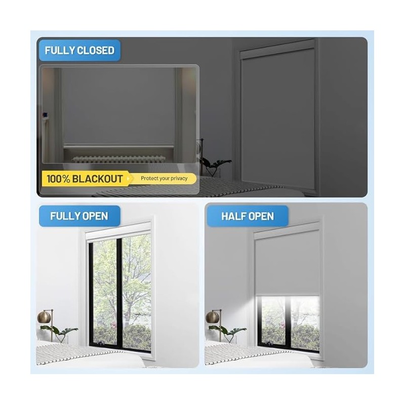 - Upgraded fabric: Our automatic blinds adopts a new upgraded fabric, which improves the wear resistance on the basis of the full blackout fabric, so that you do not have to worry about tearing in the daily use of automatic blinds. New color locking process, color locking time can reach 6-8 years. It will not fade from prolonged exposure to the sun. Let you not only feel convenient when using our automatic blinds but also enjoy the beauty and absolute privacy brought by full blackout.