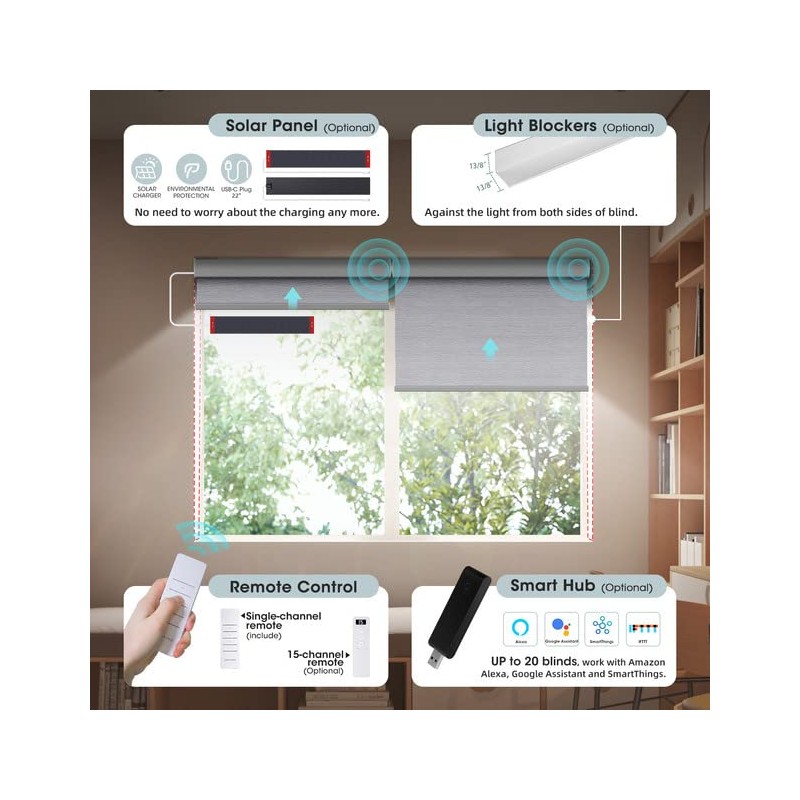 - [A Wider Selection of Accessories] We can also provide 15-channel remote control (B0BVVXRMBB), Solar panel (B0BVVWT55Q), Smart link (B0BVVWQJFR), Light Blockers (B0BYHZLDND) and Metal Brackets (B0BYHY5QPB). Our accessories are designed to increase the usefulness of the curtain. We have these accessories for use with roller blinds, if you are interested, you can check their details, they will be your best helper in your life.