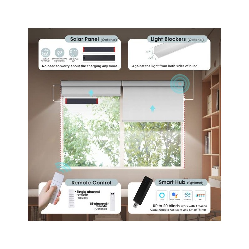 - [A Wider Selection of Accessories] We can also provide 15-channel remote control (B0BVVXRMBB), Solar panel (B0BVVWT55Q), Smart link (B0BVVWQJFR), Light Blockers (B0BYHZLDND) and Metal Brackets (B0BYHY5QPB). Our accessories are designed to increase the usefulness of the curtain. We have these accessories for use with roller blinds, if you are interested, you can check their details, they will be your best helper in your life.