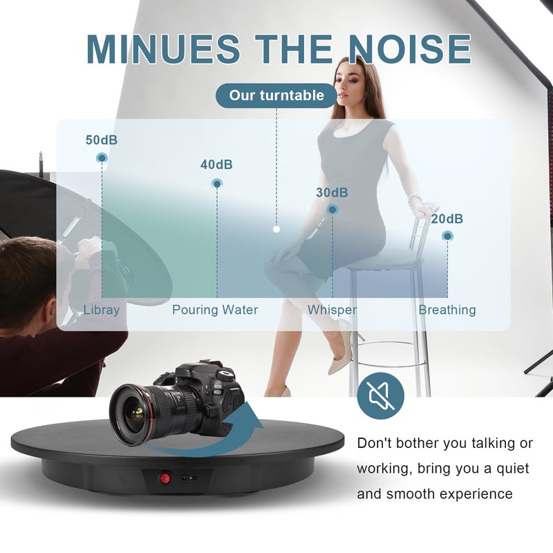 • √√√ Smoothly Rotate and Without Shaking: Our 24inch large photography display stand with the speed range 50-110 s/r (±5s/r), has a smooth motor (≤50db) to avoid shake and noise during the video. Perfect for 360 degree images, short video, 3d models, exhibition and other product display.
