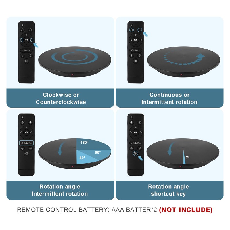 • √√√ Make Your Products Better from All Angles - The rotating display can move 1°/45°/90°/180° increments by remote control, so that you can take photos of the subject from every angle, get consistent views for 360 degree product shots.