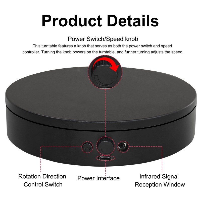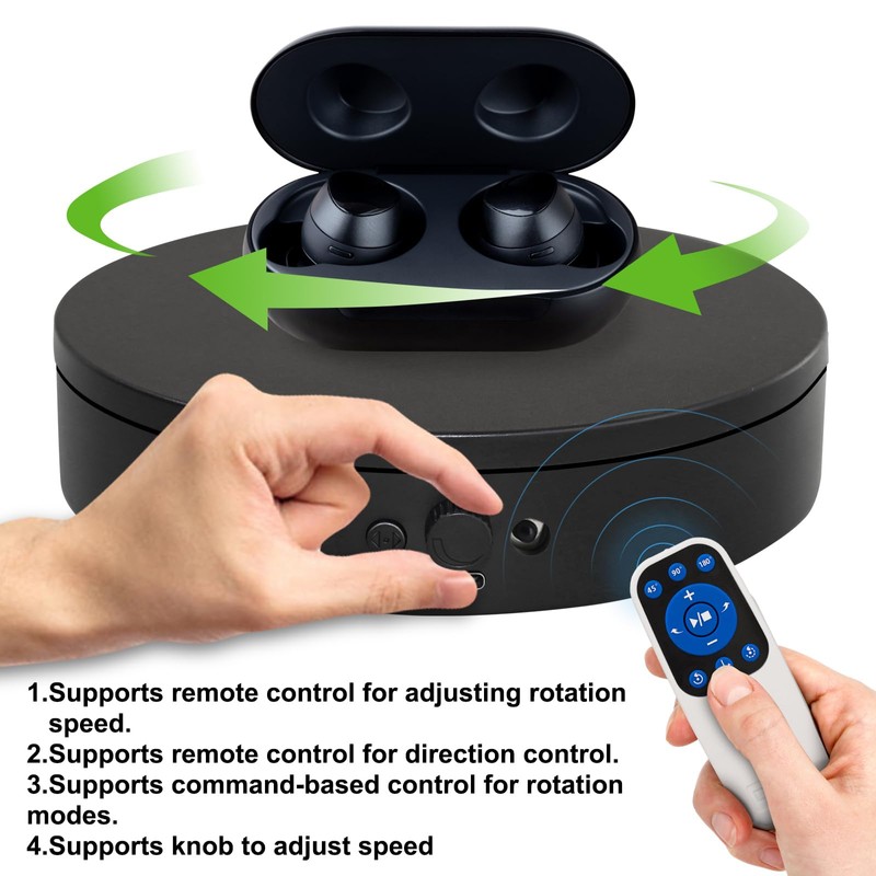 - 【User-Friendly Remote Control】This user-friendly remote control offers multiple rotation modes, including continuous rotation, single-step rotation, repeated step rotation, and pendulum (swing) rotation, making it versatile and easy to use for various applications. The knob is used to turn the turntable on/off and adjust the speed. Turning the knob to the right switches it on, and continuing to turn it further increases the turntable speed.Remote control adjusts speed, direction, and pause.