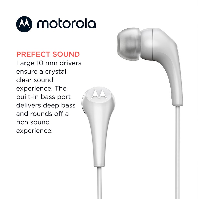 - Auriculares con micrófono: los auriculares con cable Motorola están diseñados pensando en la comodidad, acústica fuerte y portabilidad. Estos auriculares intraurales te dan el ajuste que esperas de los auriculares tradicionales en un diseño con forma para un sonido de alta calidad.